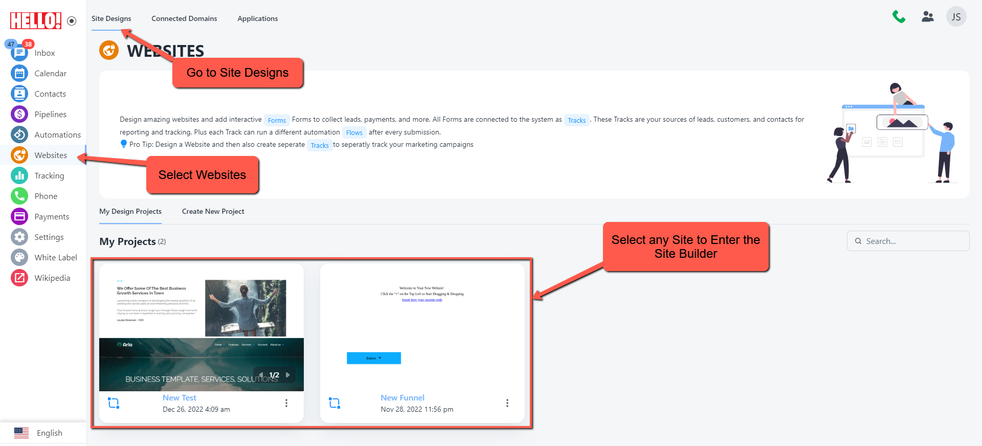 Go to Website, Site Designs and Select any of the Website to enter the Site Builder.