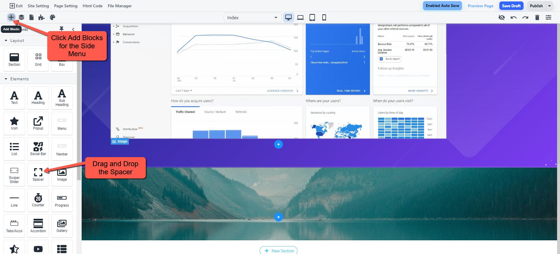 Clicking the Add Block will Show a Side Menu that have the different Items to Add. Drag and Drop the Spacer from the Elements.