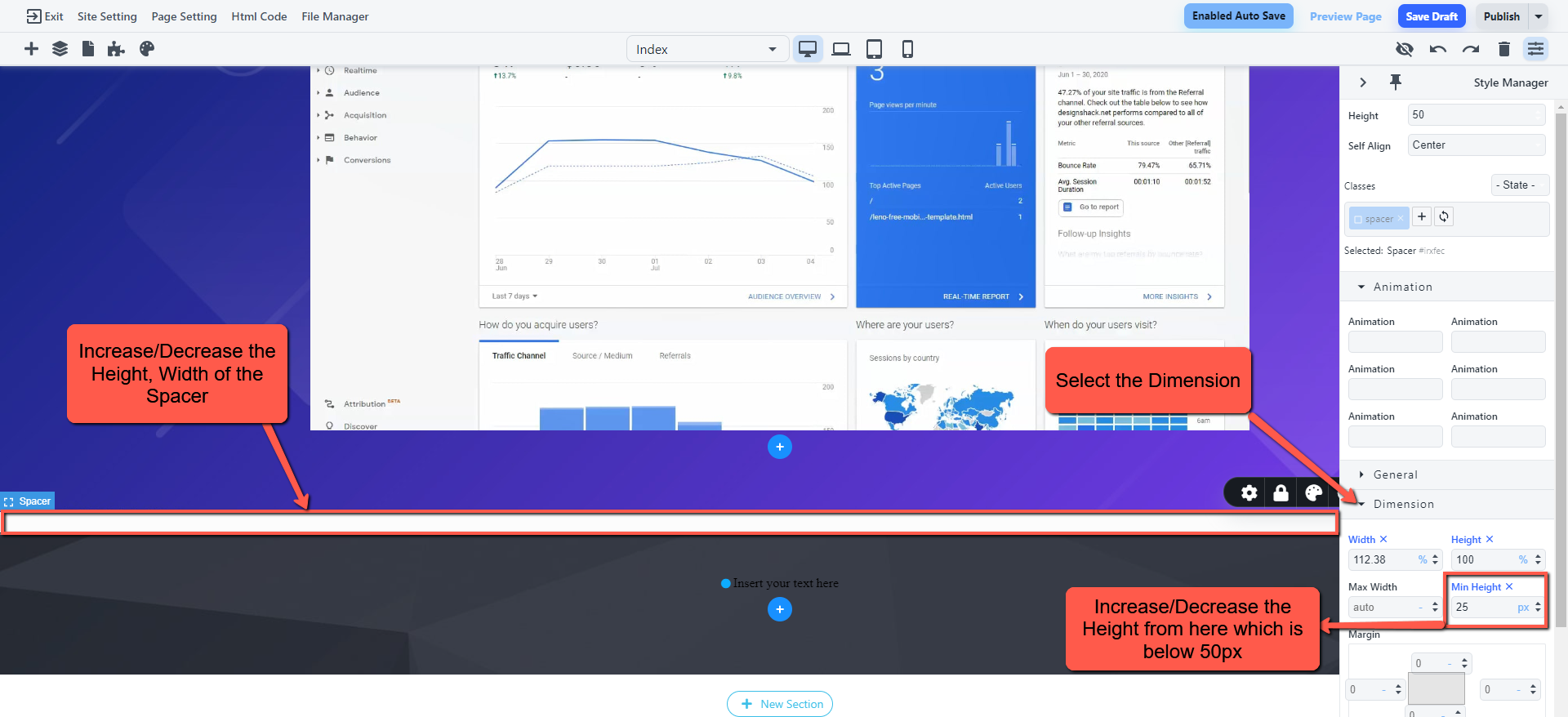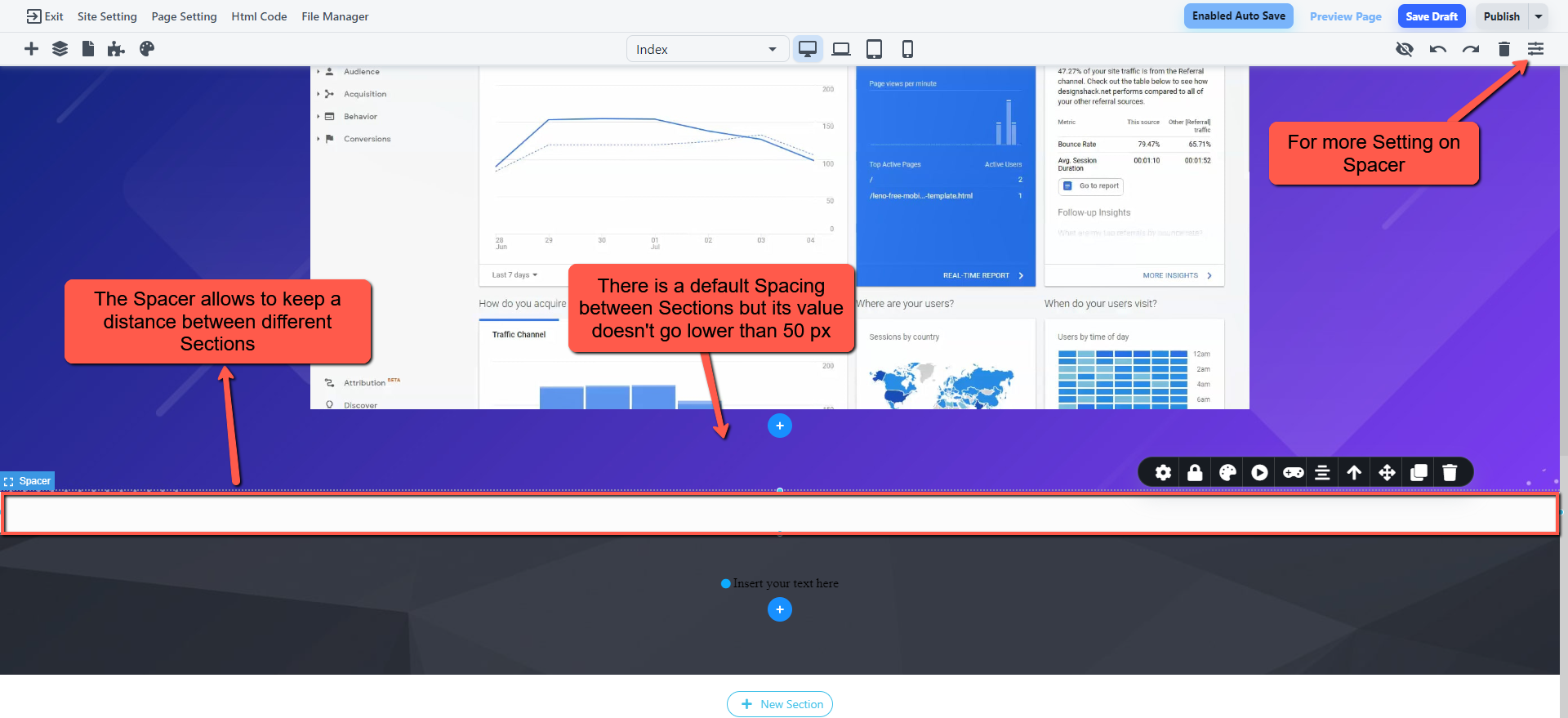 Select the Spacer and Add it between Sections. Give it a different Color according to your preference. Click the Spacer and for more Settings Follow the Image below.