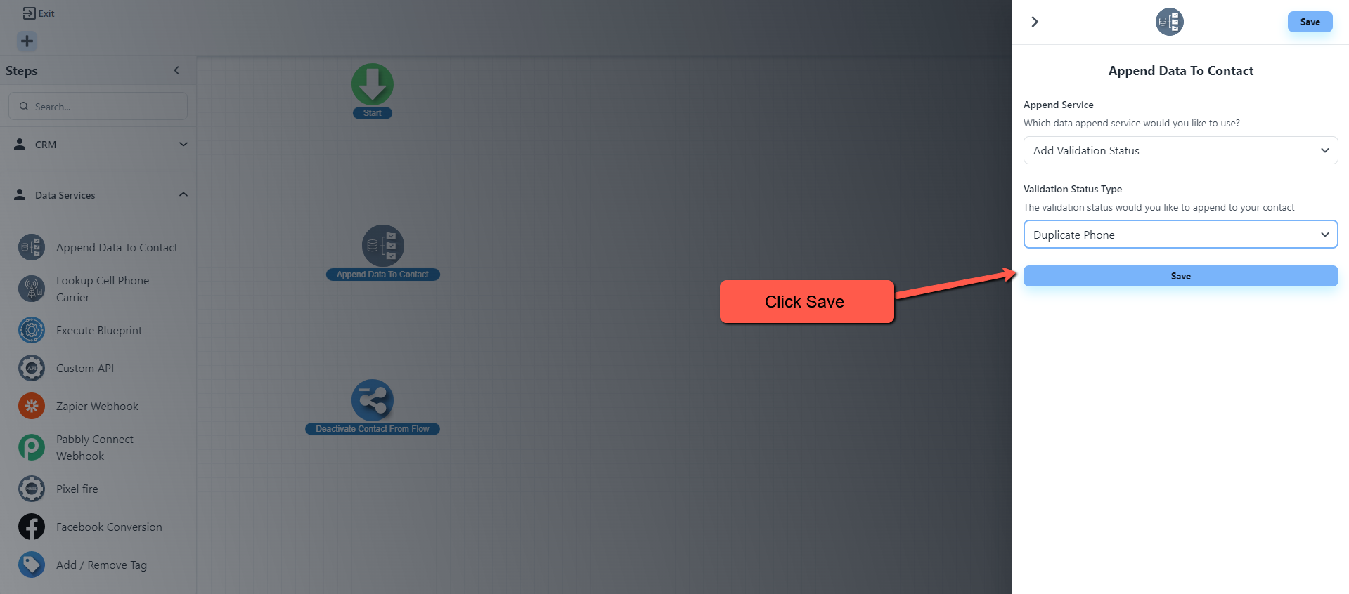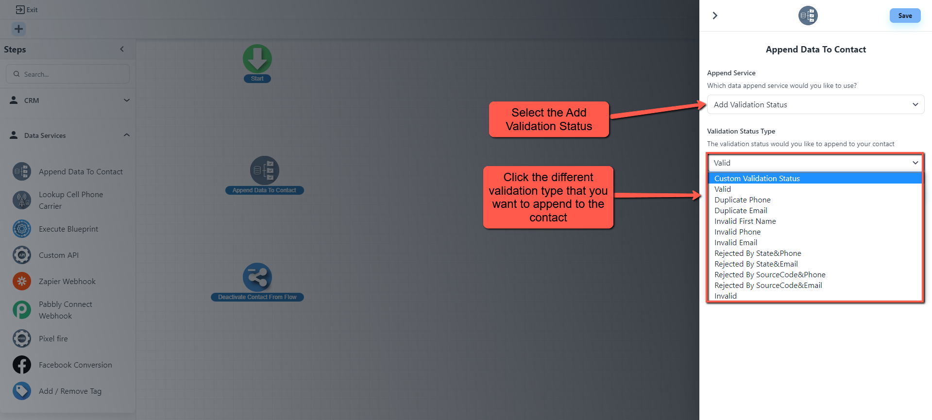Inside the flow builder select the add validation status from the append service. Also the validation status that you want to add.