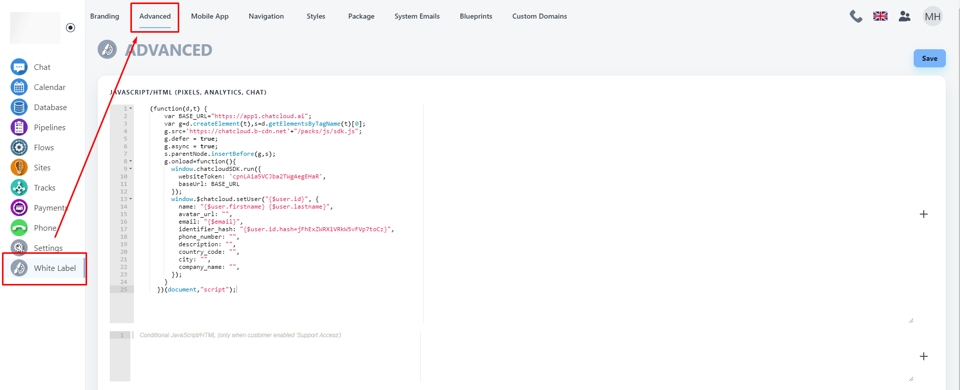 Please, navigate to the ‘Settings’ on the left menu bar and click on the ‘Advance’ tab on the top menu bar.