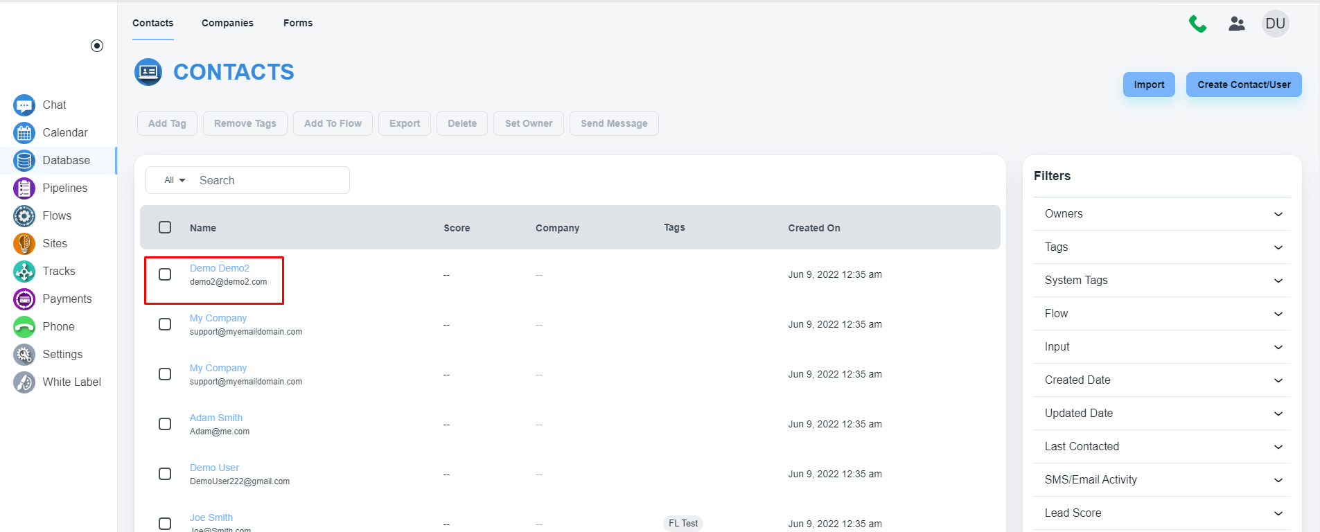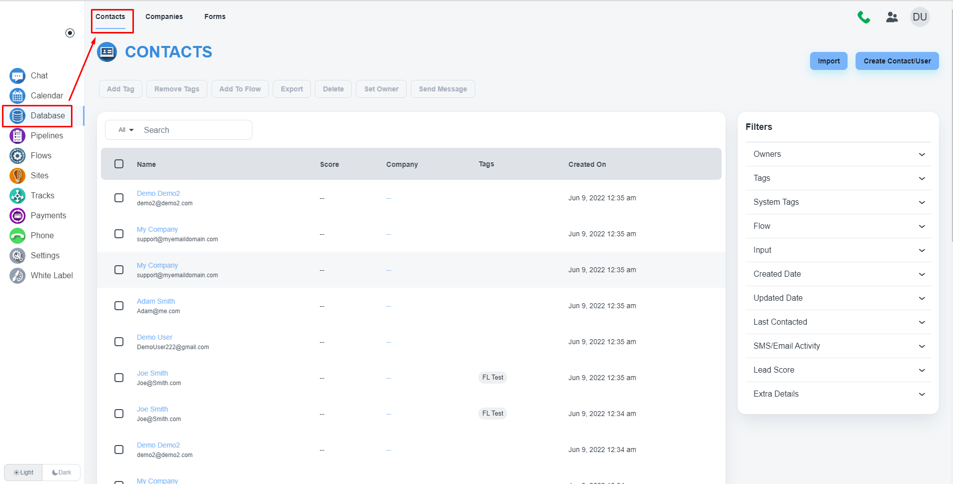 Please, navigate to the ‘Database’ on the left side menu. Once the page is open, please click on the ‘Contacts’ on the top menu.