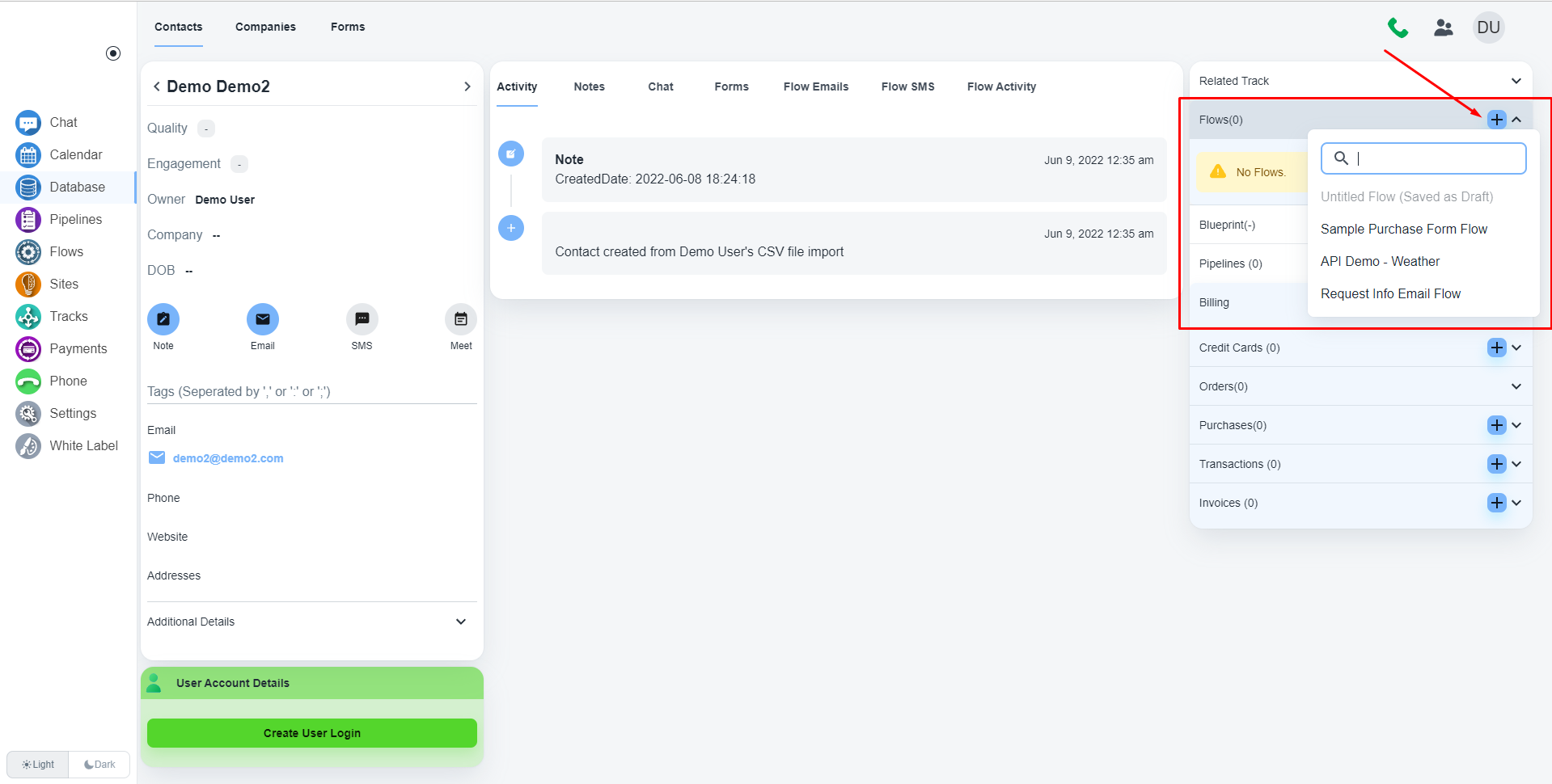 On the right-hand side, there is an option to add the contact to a flow. Please, click on the ‘Plus’ icon to view the existing flows.
