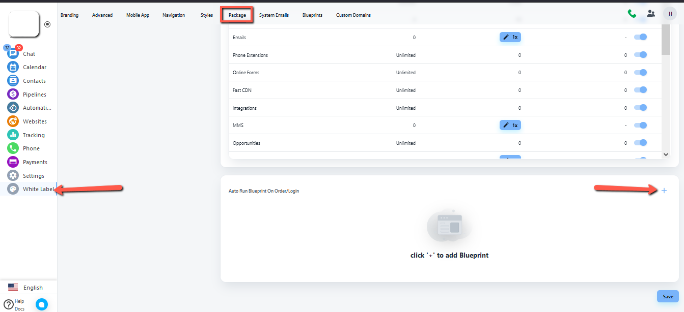- Click on the white label tab from the left side, Click on the Package from your top address bar and then click on the + button.