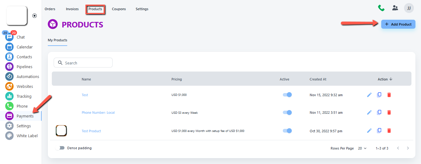 - First, you have to click on the Payments tab from the left side, Click on the Products from your top address bar, and then click on the Add Product button.
