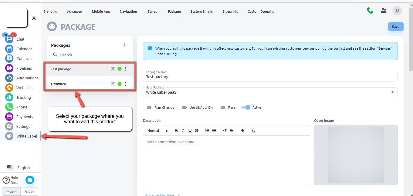 - Now Add the product to the package. Click on the White label tab and then click your package on the top bar and select the package where you want to add this product for your customers.