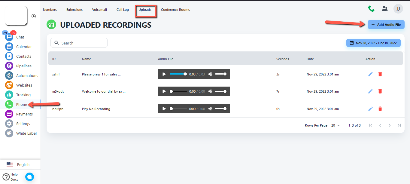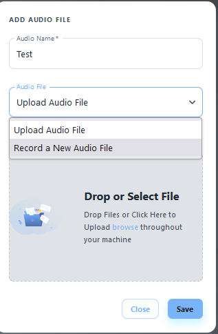 - First, you have to click on the phone tab from the left side, Click on the upload tab from your top address bar and then click on add audio file.