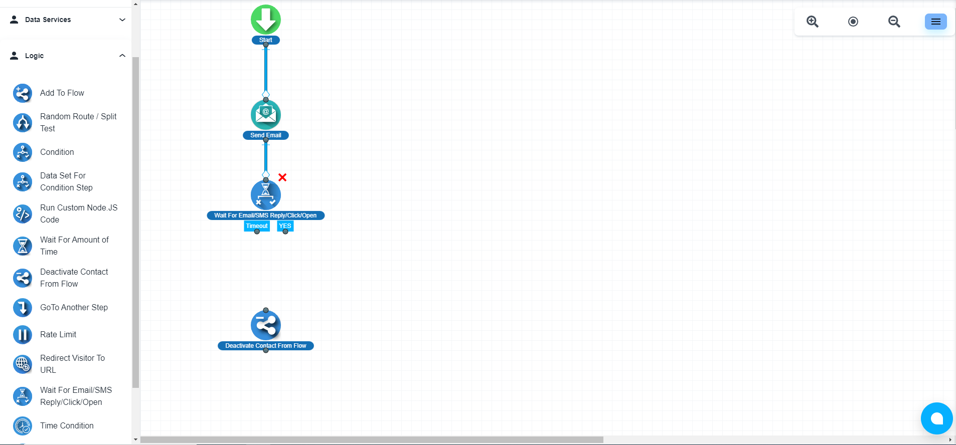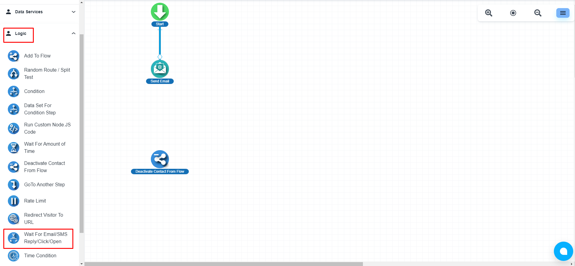 Please add the ‘Wait For Email/SMS Reply/Click/Open’ step to your flow under the Email Send’ step. This step is available under the ‘Logic’ section.
