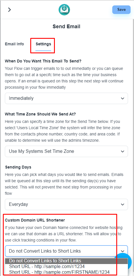 Please, navigate to the ‘Settings’ tab of the ‘Email Send’ step. On the ‘Custom Domain URL Shortener’ dropdown, please select any option except ‘Do not Convert Links to Short Links’