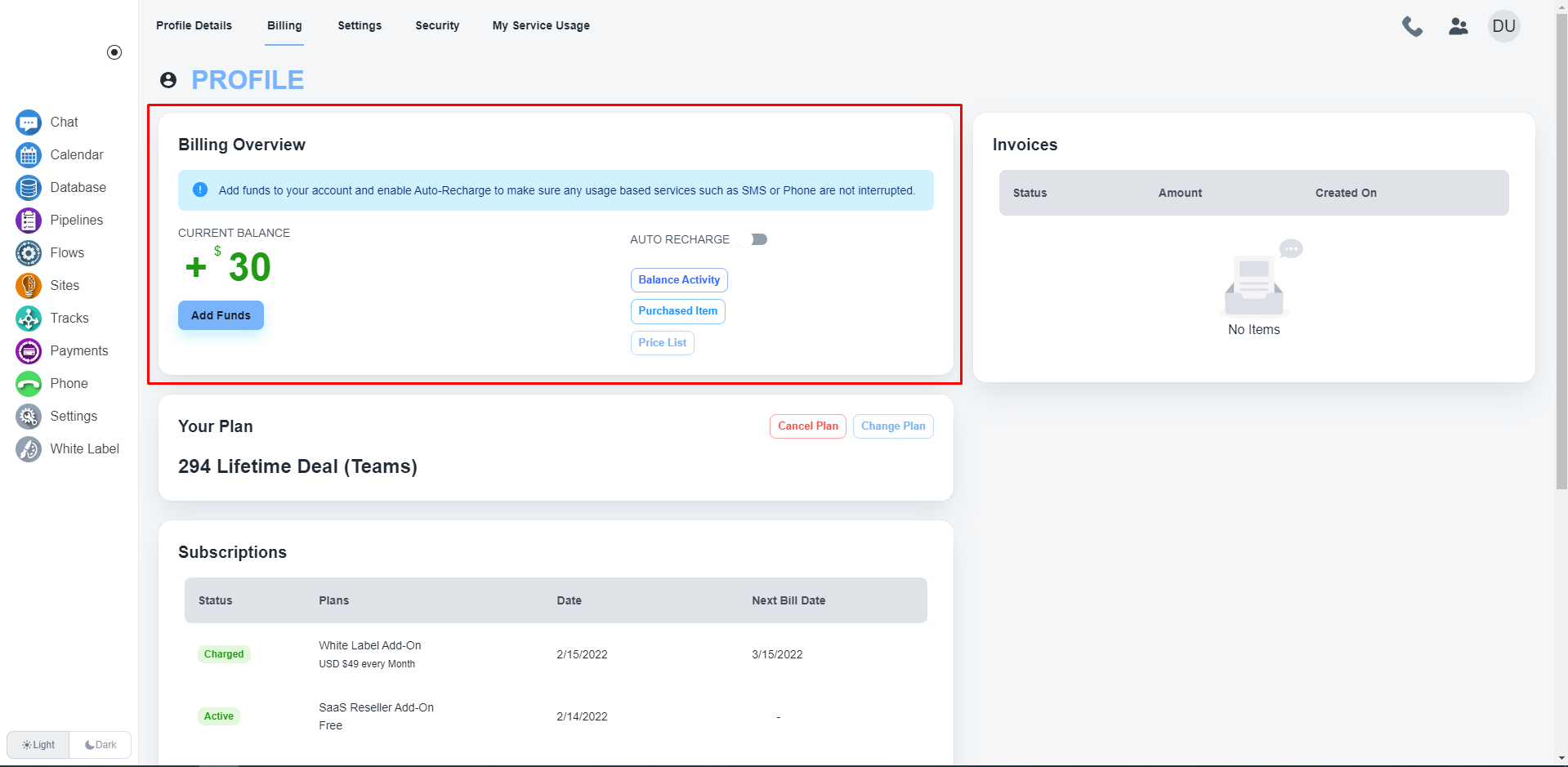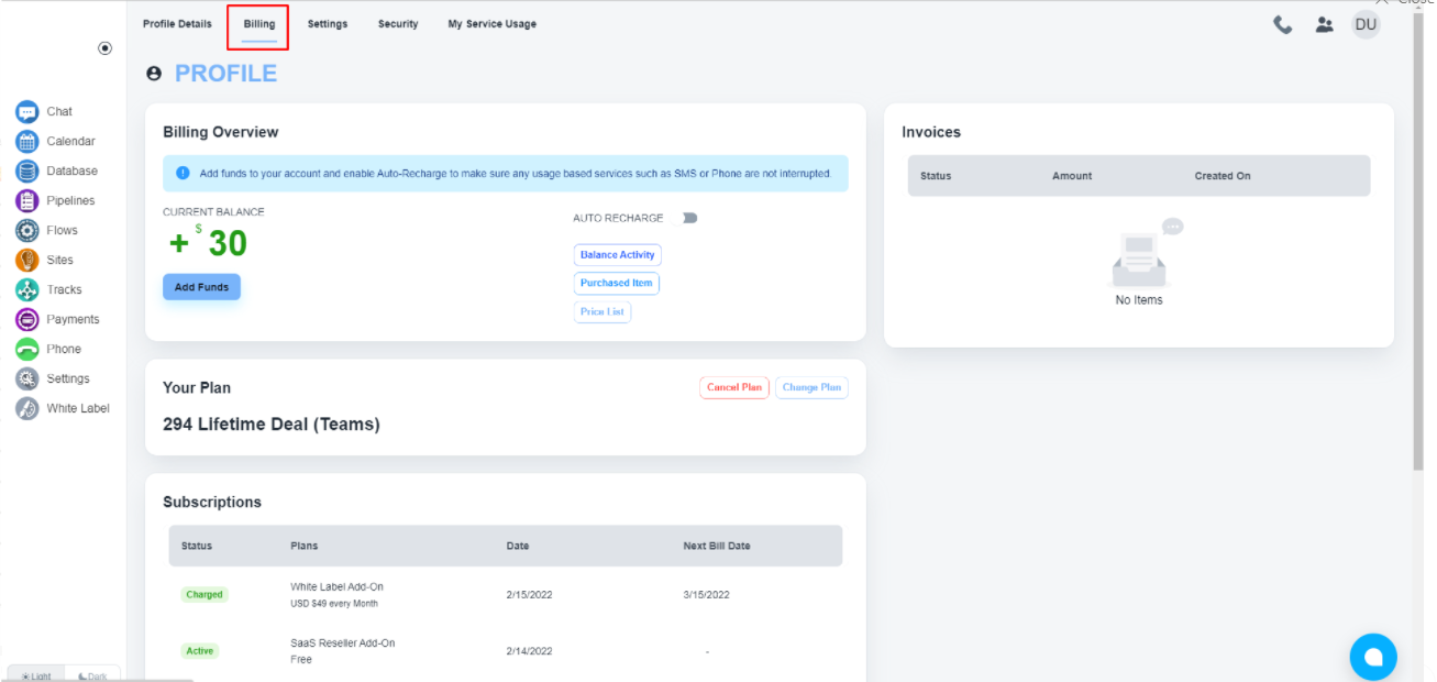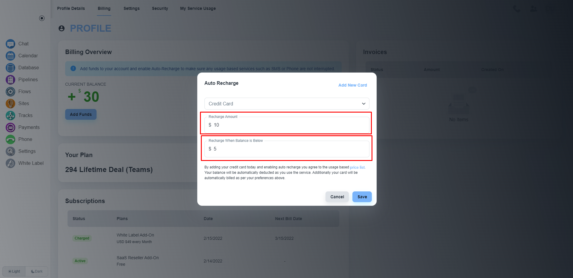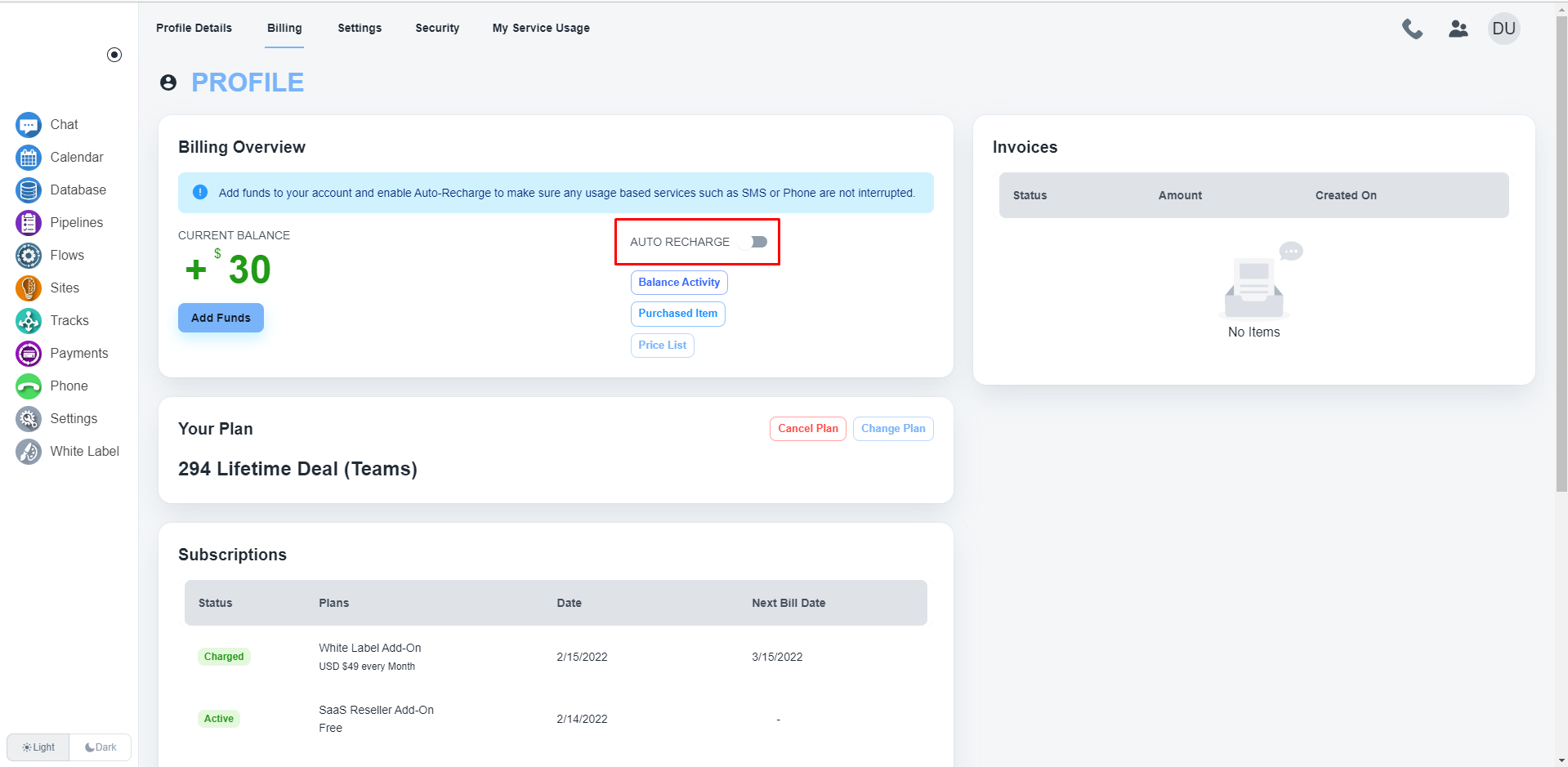 System offers you the feature to auto-recharge your account to ensure any usage-based services such as SMS or Phone are not interrupted. You only need to enable this toggle to activate the auto-recharge service.