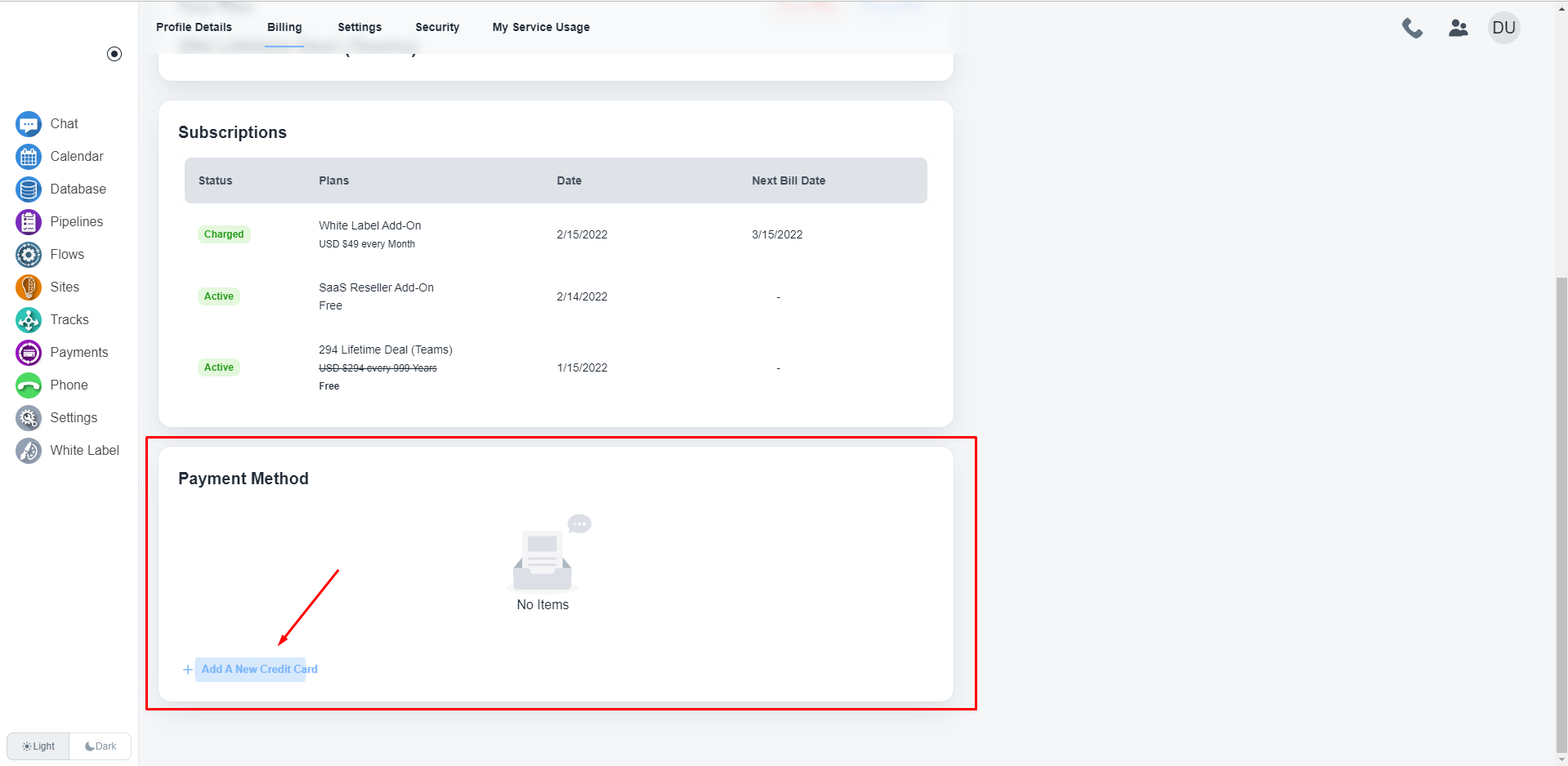 At the bottom of the billing section, you will get the option to add credit card/s to your account to recharge your account.