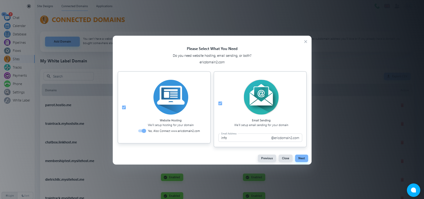 Navigate to the domain panel by clicking the “Sites” on the left side menu. Then when you have that page open you will see a link to “Connected Domains” on the top of your page, please click that.
