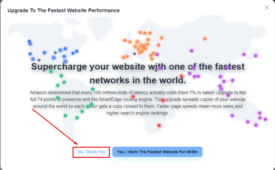Now, the system will offer you the option to choose a faster CDN for a better web service experience for your users. Please, click on the ‘No, Thank You’ button unless you want a faster CDN for $5/month.