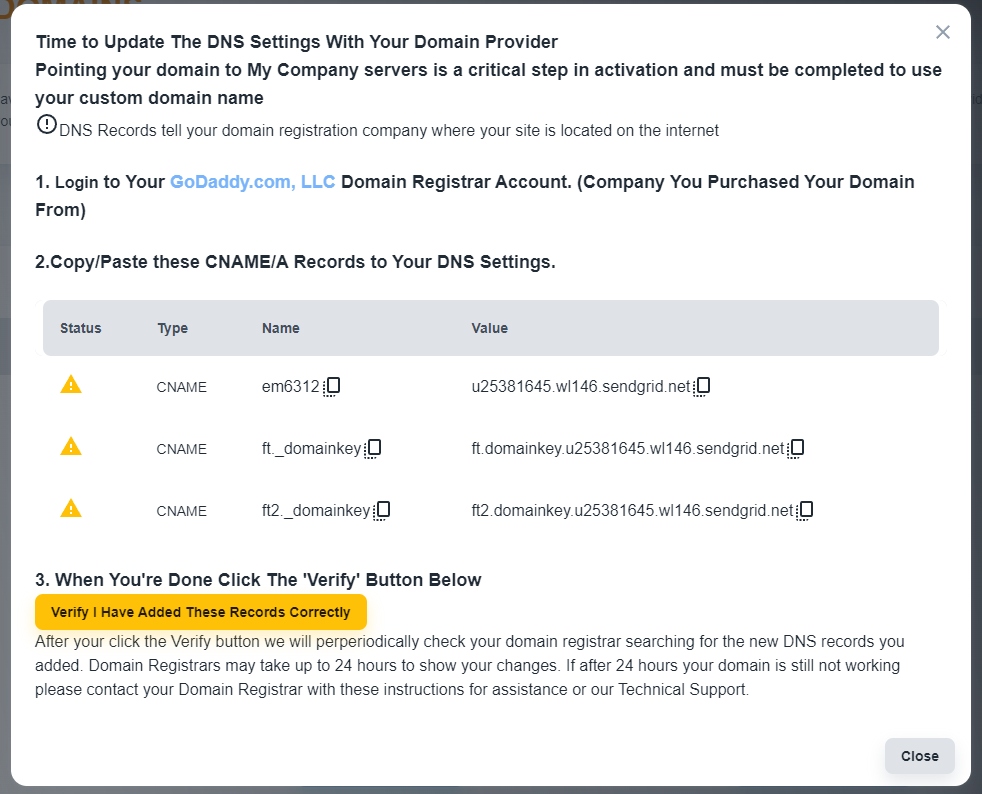 Please, wait for a while. The system will provide you with the required DNS records you need to add to your domain registrar.
