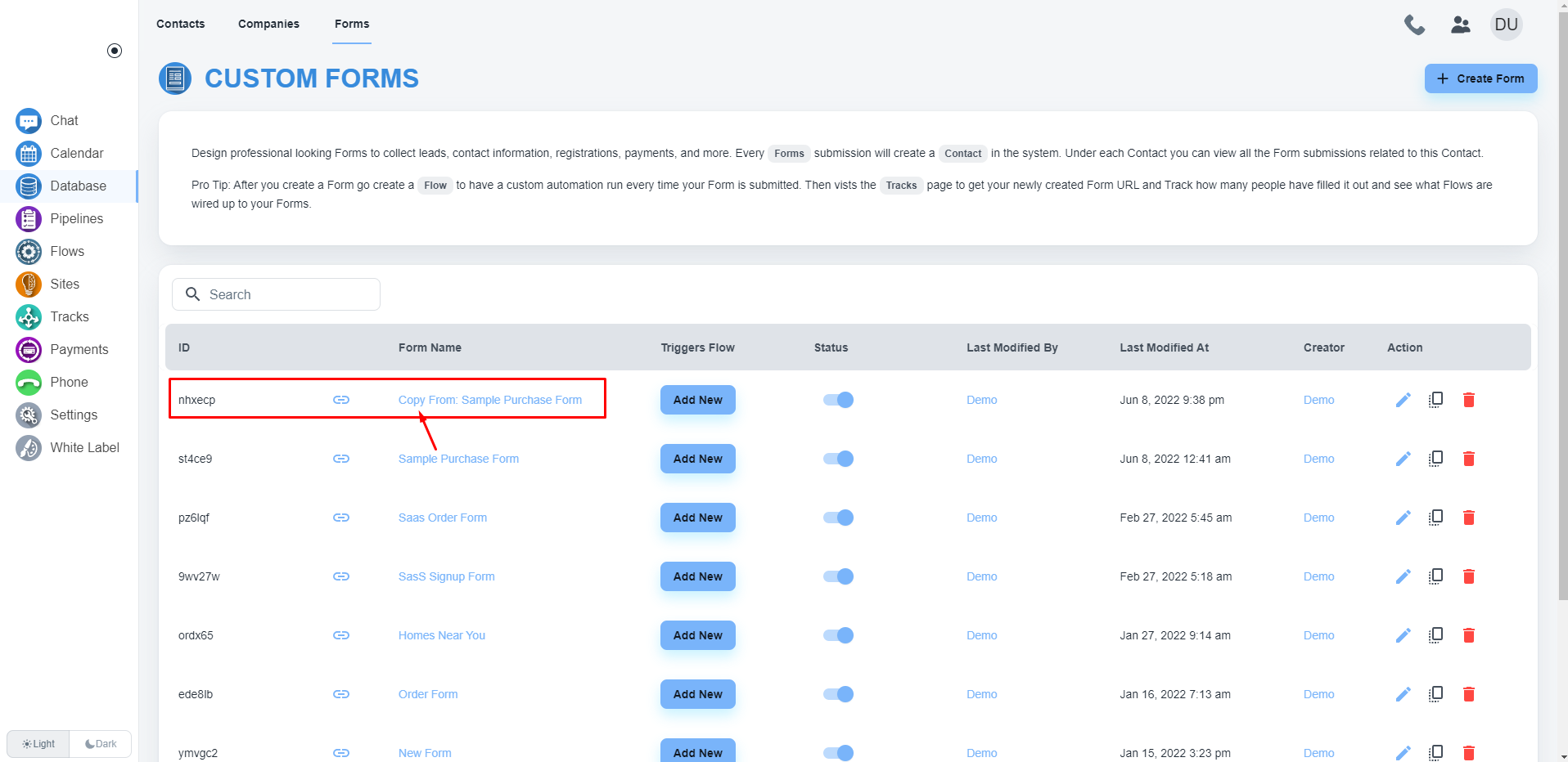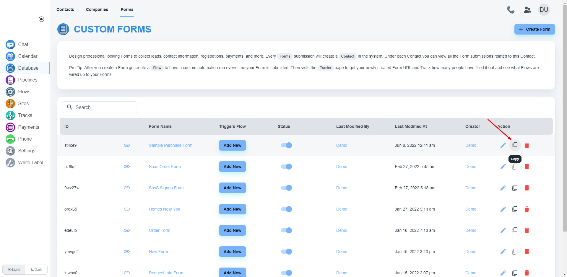 Please, click on the ‘Copy’ button of the concerned form, and the system will make a duplicate copy of the existing form.