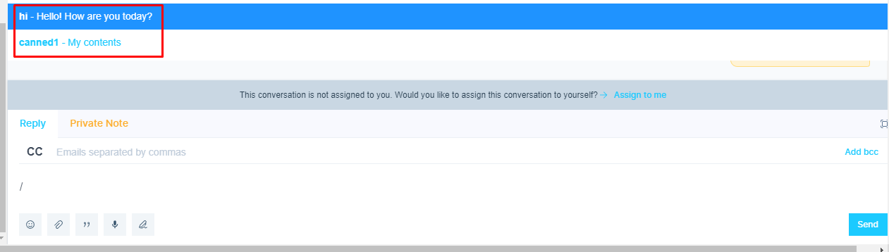 While sending messages, please type ‘/’ to view all the canned messages. You can simple type /canned1 to enter that content.