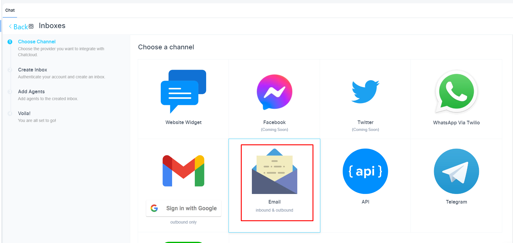 Please, navigate to the ‘Chat’ on the left menu bar. Once the page is opened and clicked on the ‘Inbox’ on the top menu bar. Finally, click on the ‘Add Inbox’ button.