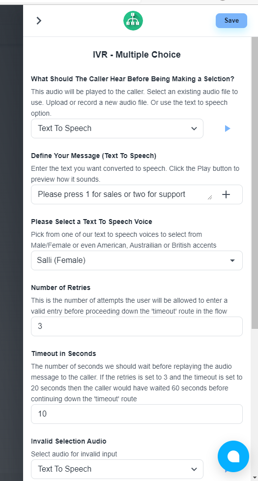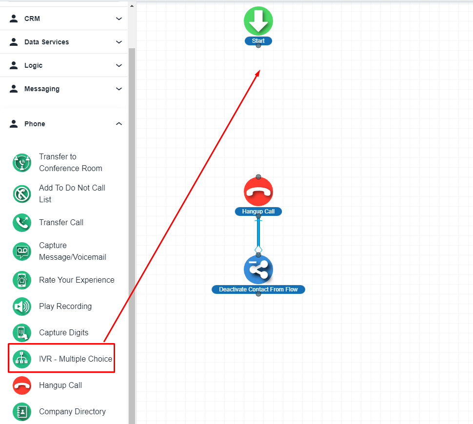 Inside the flow builder, please drag the ‘IVR - Multiple Choice’ step. This step is available under the ‘Phone’ section.