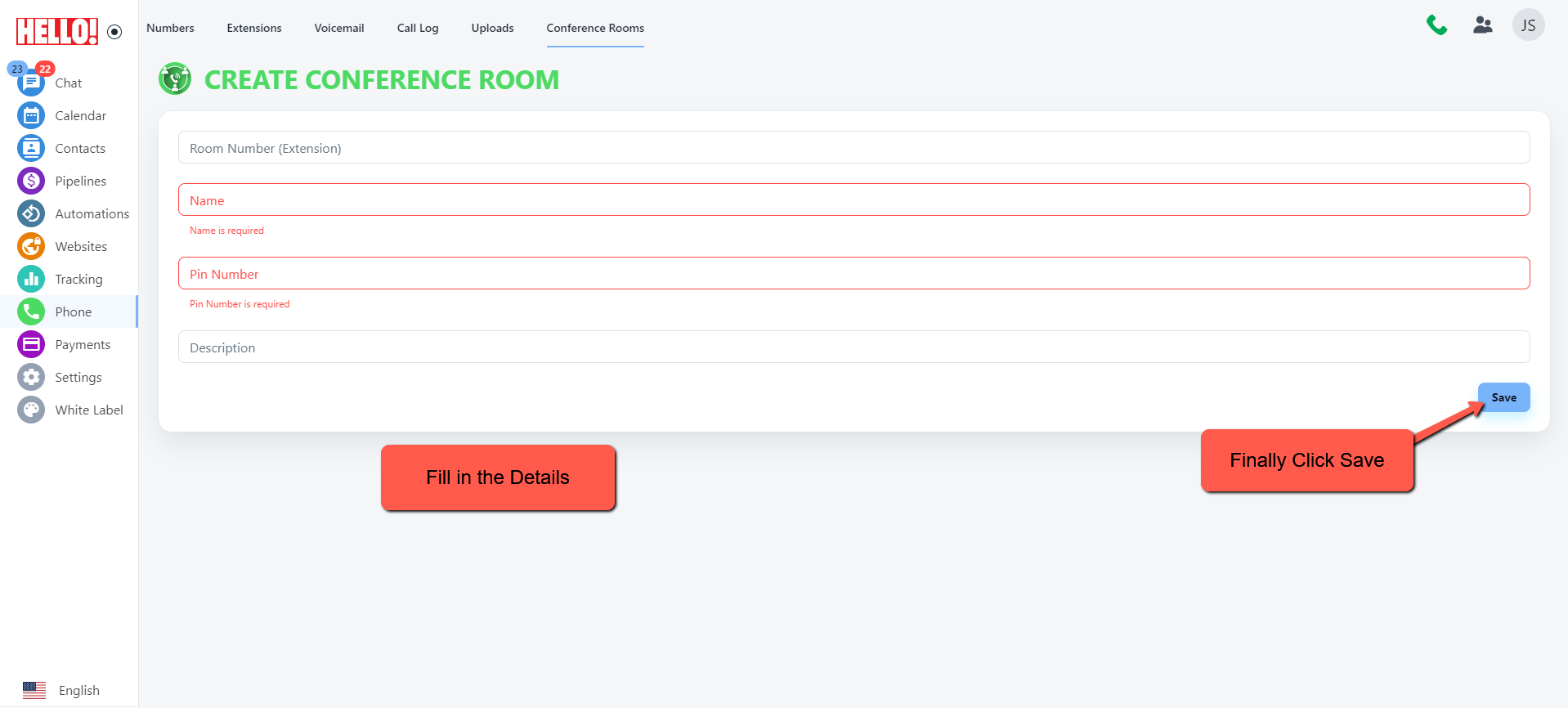 After creating the conference room, fill in all the details including unused extension, Name, Pin number and Description. Click save and you are good to go.