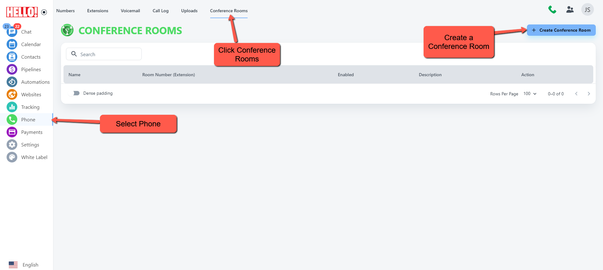 After selecting the phone, on the top menu click conference room. Finally create a conference room.