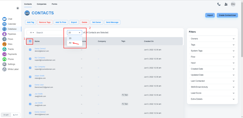 Please, navigate to the ‘Database’ on the left side menu. You will get the list of all contacts