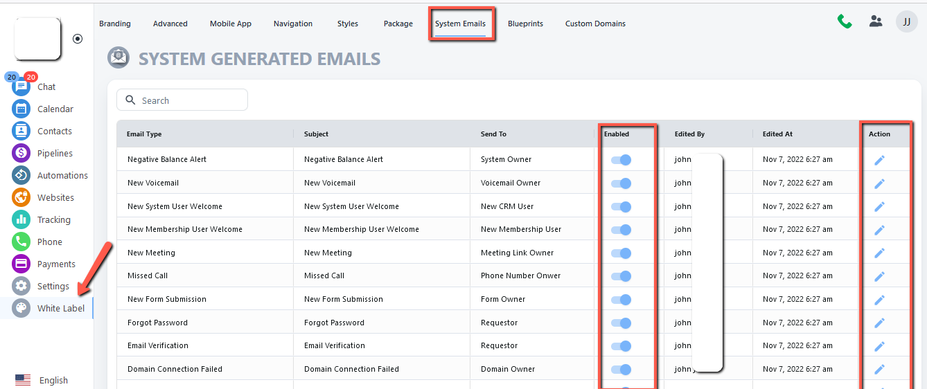 First, you have to click on the white label tab from the left side, Click on the System Emails from your top address bar, If you want to Enable or Disable Email turn ON/OFF the notification.