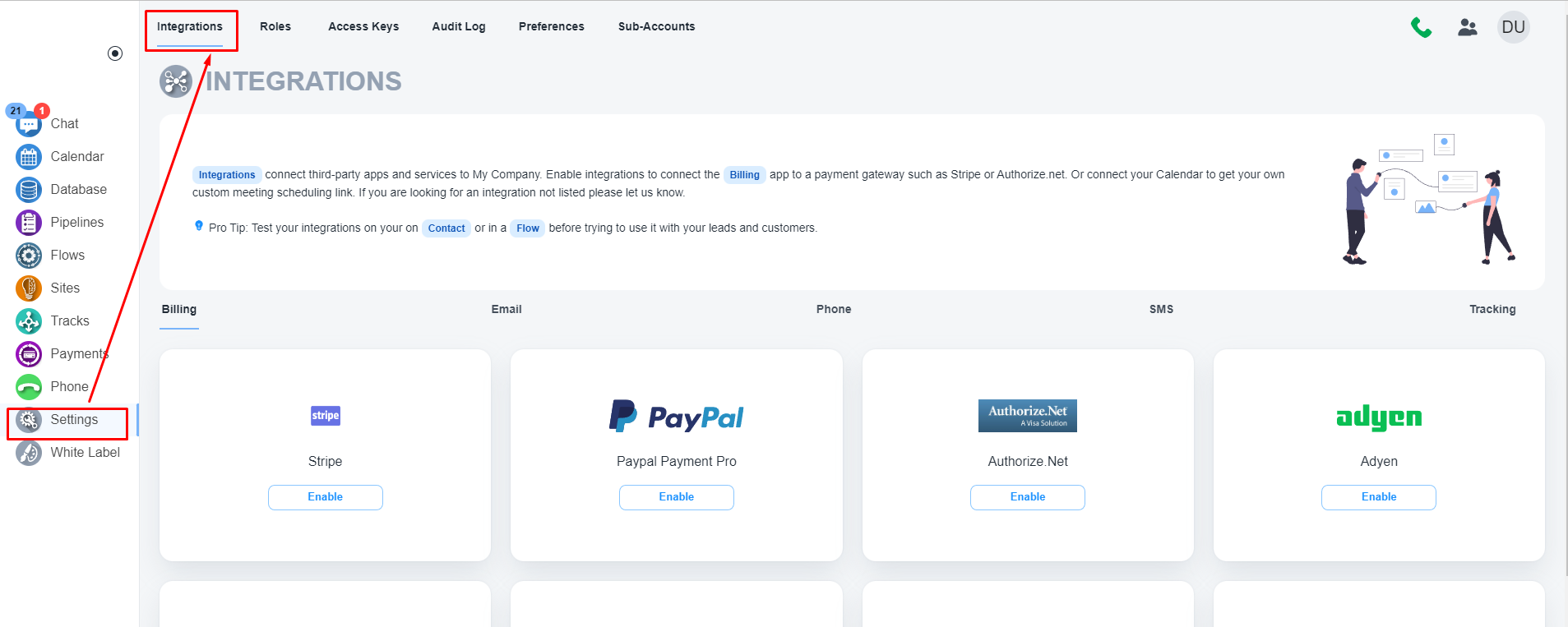 Please, navigate to the ‘Settings’ menu on the left menu and on the ‘Integration’ tab