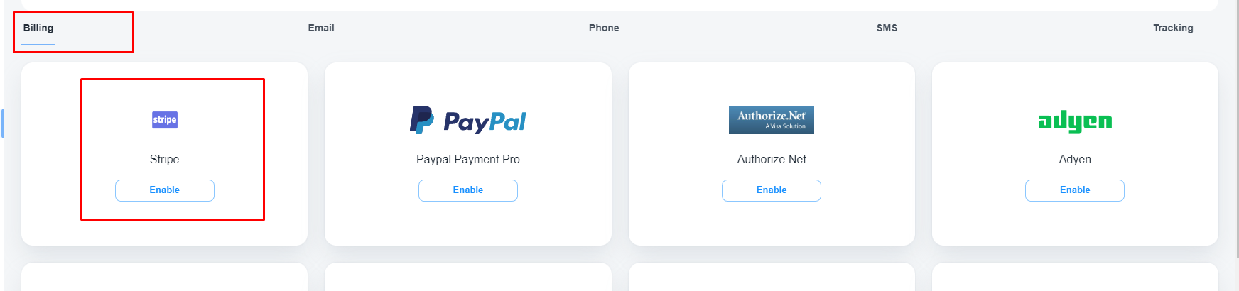 Under the ‘Billing’ tab, you will get the Stripe integration