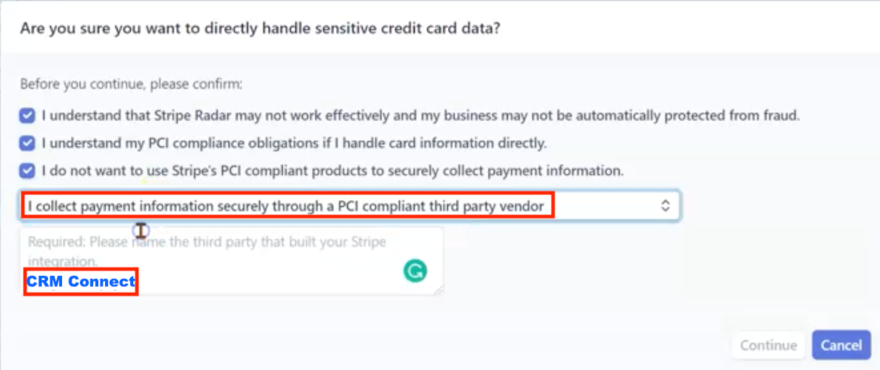Make these settings on Stripe to Turn on option for PCI compliant third party vendor: