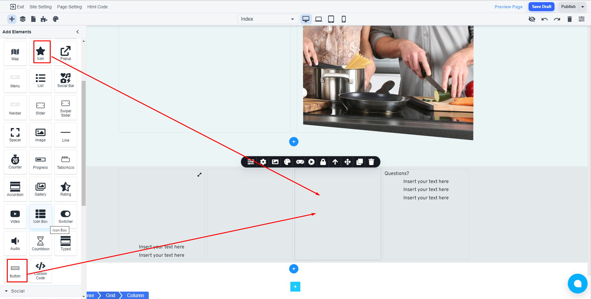 Please, drag the ‘Button’ or “icon’ element to your concerned position