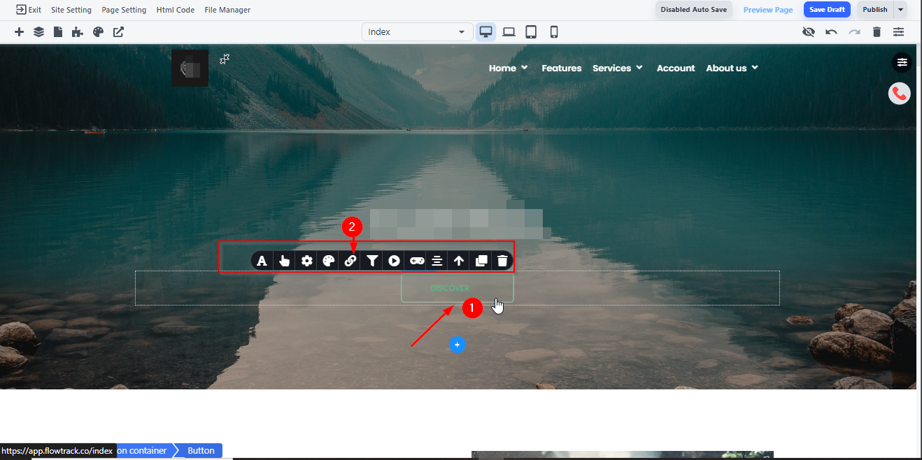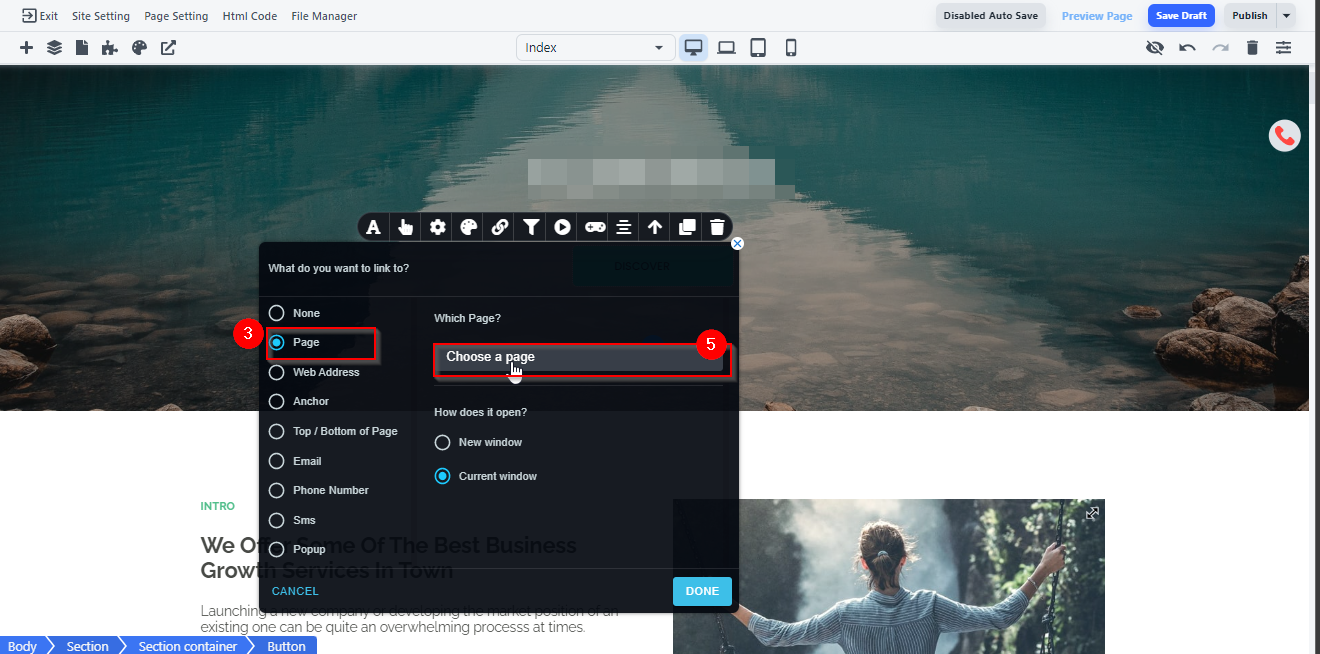 - If you want to link the button with page click the page bullet and select the desire page you want to link as shown below: