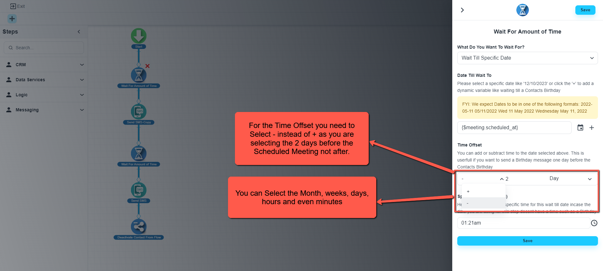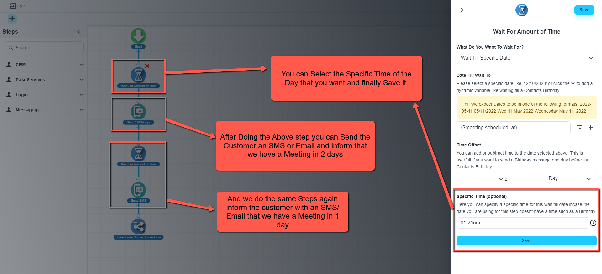 When you have completed the Wait for Amount of Time Step you can send the SMS or an Email. This will notify the Customer about the that is Scheduled in the 2 days. You can repeat the Steps again by adding the Wait for Step and an SMS/Email about tomorrow Meeting.