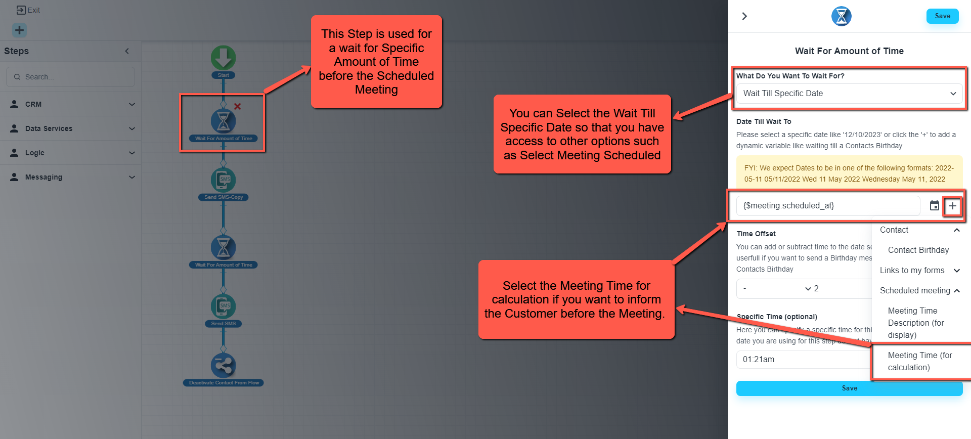 You can find this item in the Logic Section and is basically used for informing the Customer just before the Scheduled Meeting whether it could be weeks, days or even minutes. It can be used for multiple scenarios but in this case we are using it as a reminder for the Scheduled Meeting.