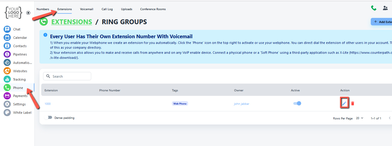 - Go to the phone tab. Click on the phone tab then click on the extension tab and then click on the pencil icon for the edit extension tab.