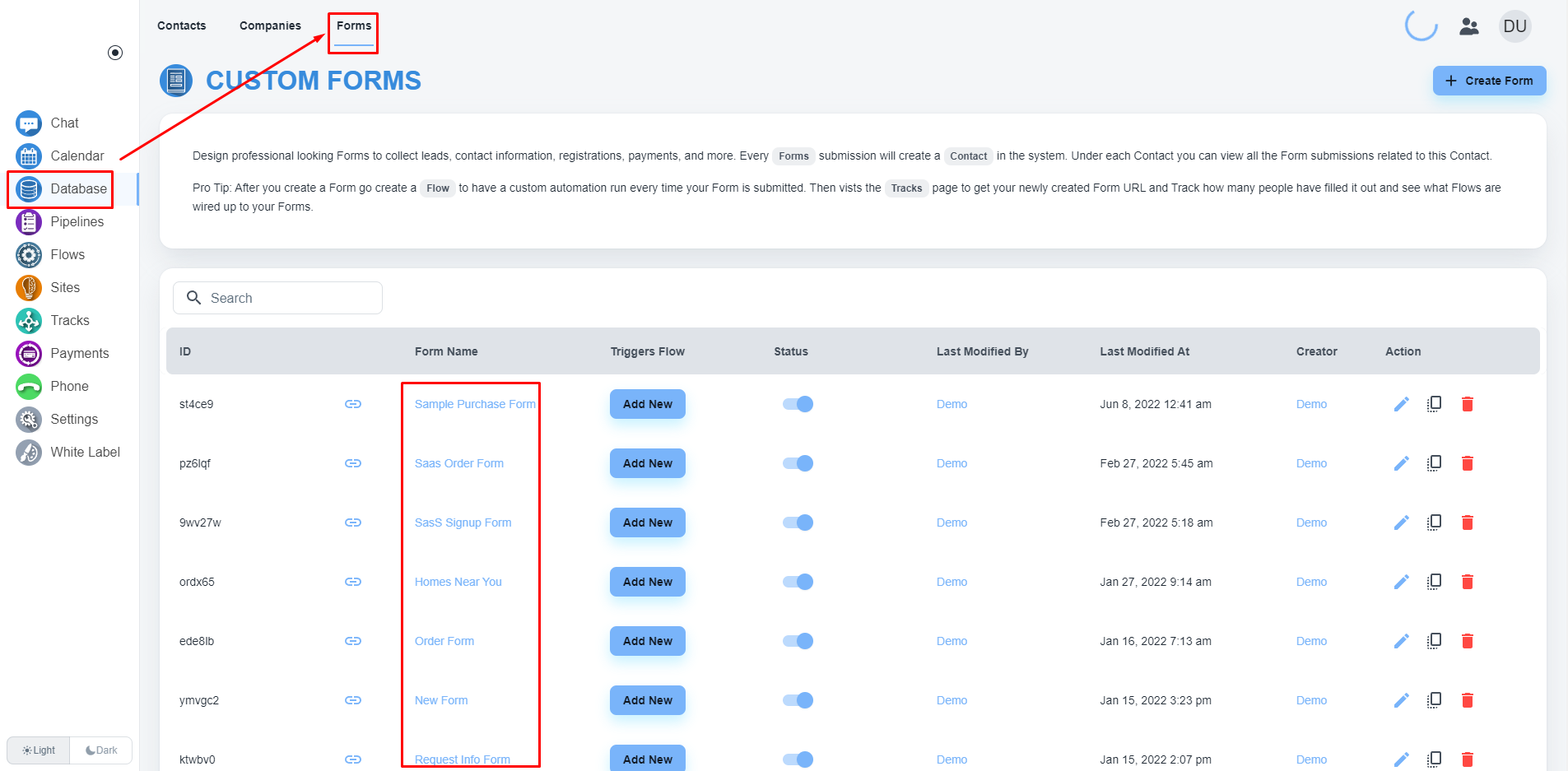 Navigate to the form builder by clicking the “Database” on the left side menu. Then when you have the database page open you will see a link to “Forms” on the top of your page, please click that. Please, open your concerned form.