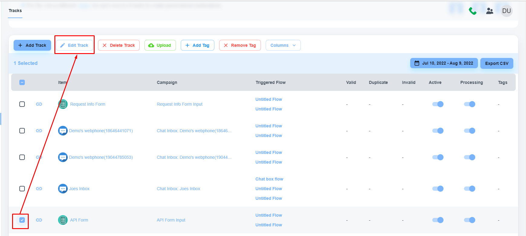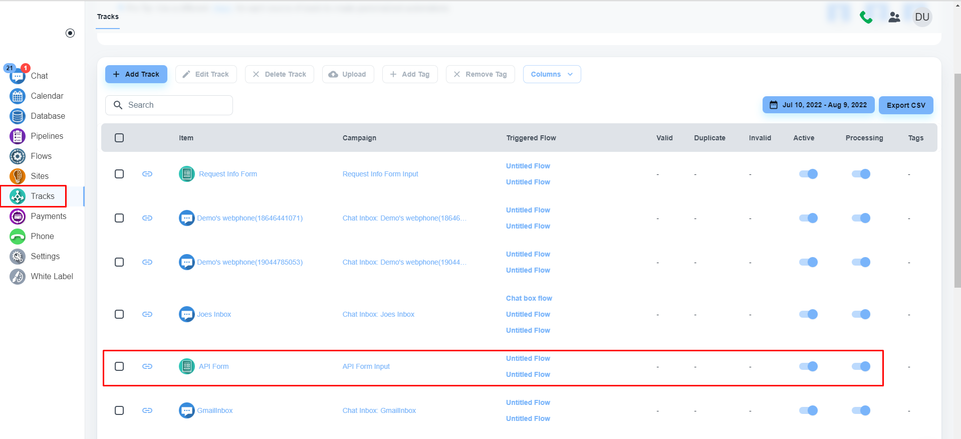After saving the form, please, navigate to the ‘Tacks’ on the left menu bar. Here you will have all the tracks. You will also get the same form on the track list.