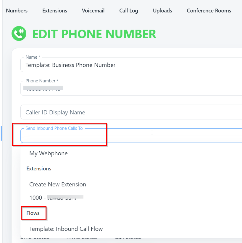 - Under Edit Phone Number. Go to option “Send Inbound Phone Calls to” as mentioned in below screenshot: