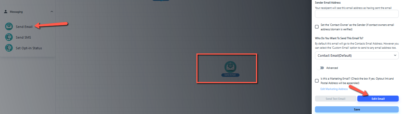 - Click on the Edit email step, mark the Checkbox of edit email marketing and click on Edit email marketing and set the email which you want to opt in or Opt-out.