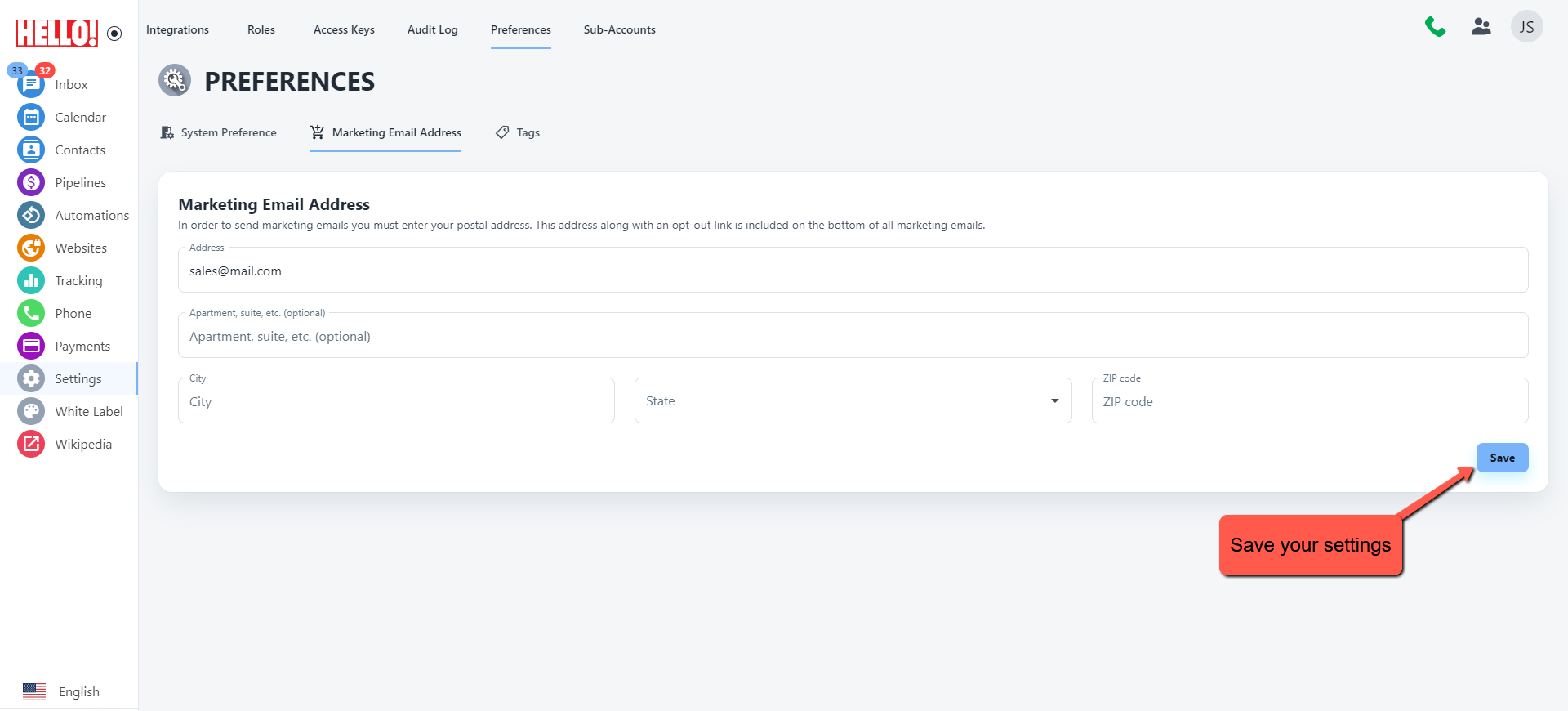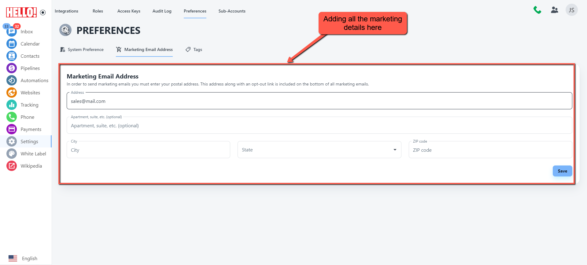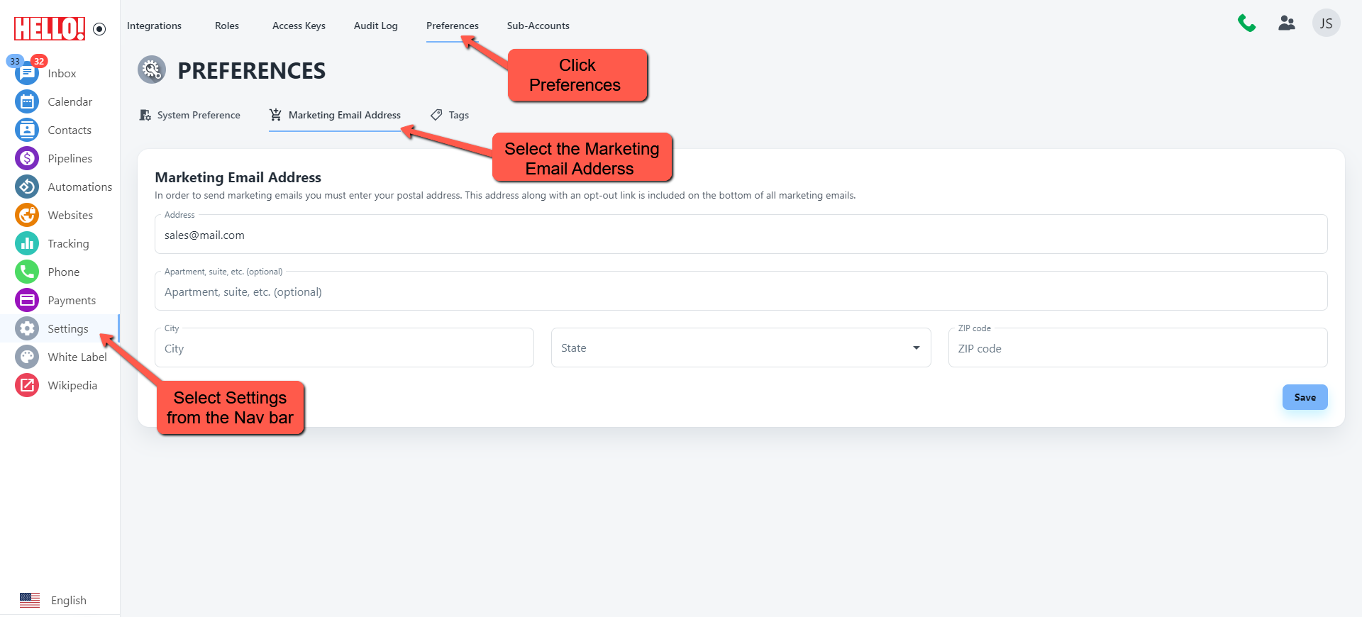 Click settings from the Nav bar and select preferences, inside preferences click Marketing Email Address to add your marketing details.