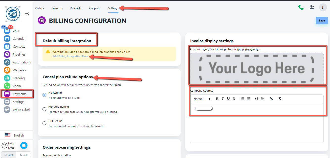 Select the method of integration. Add logo to your invoice. Set the plan for a refund.
