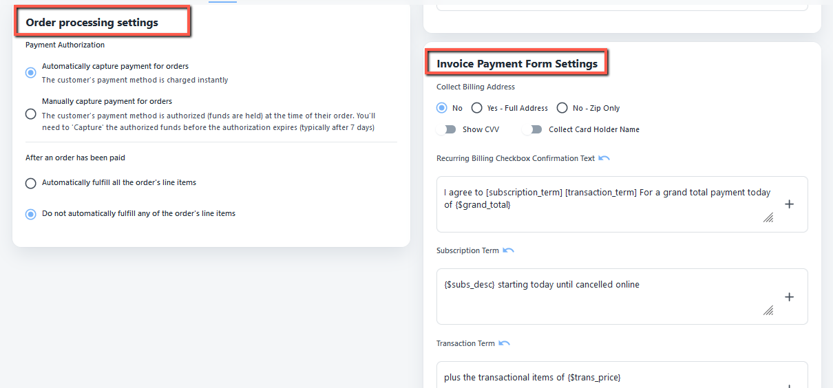 - Now you need to set order processing settings and Invoice payment form settings then your process is complete.
