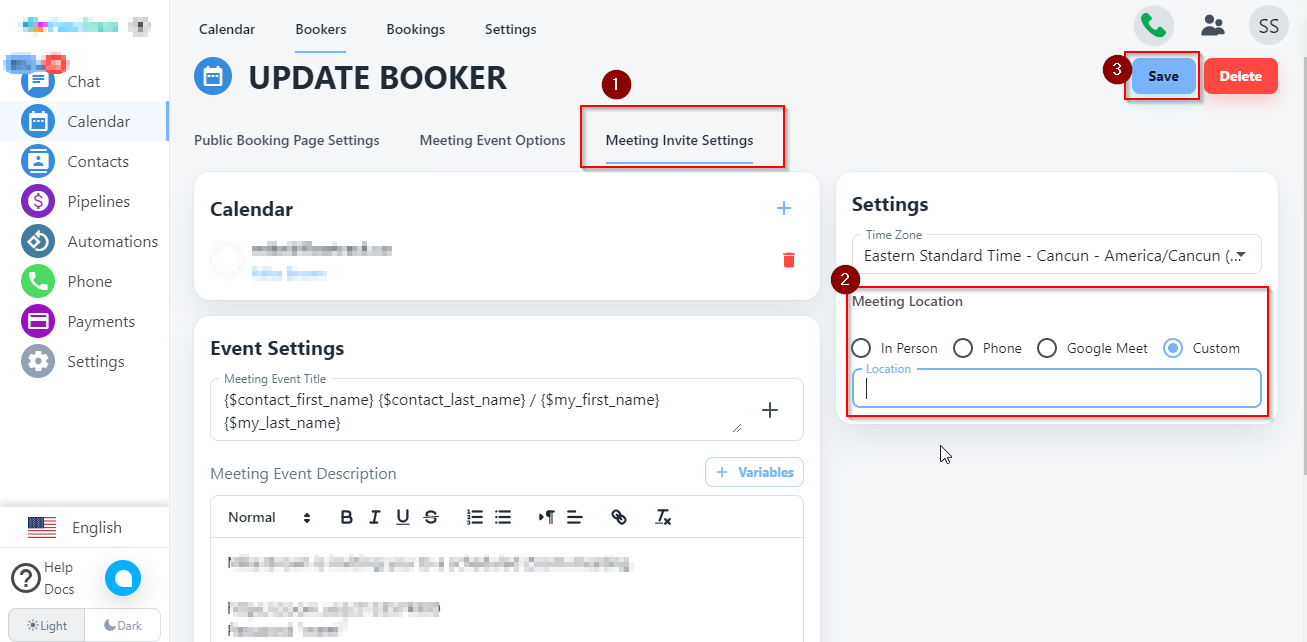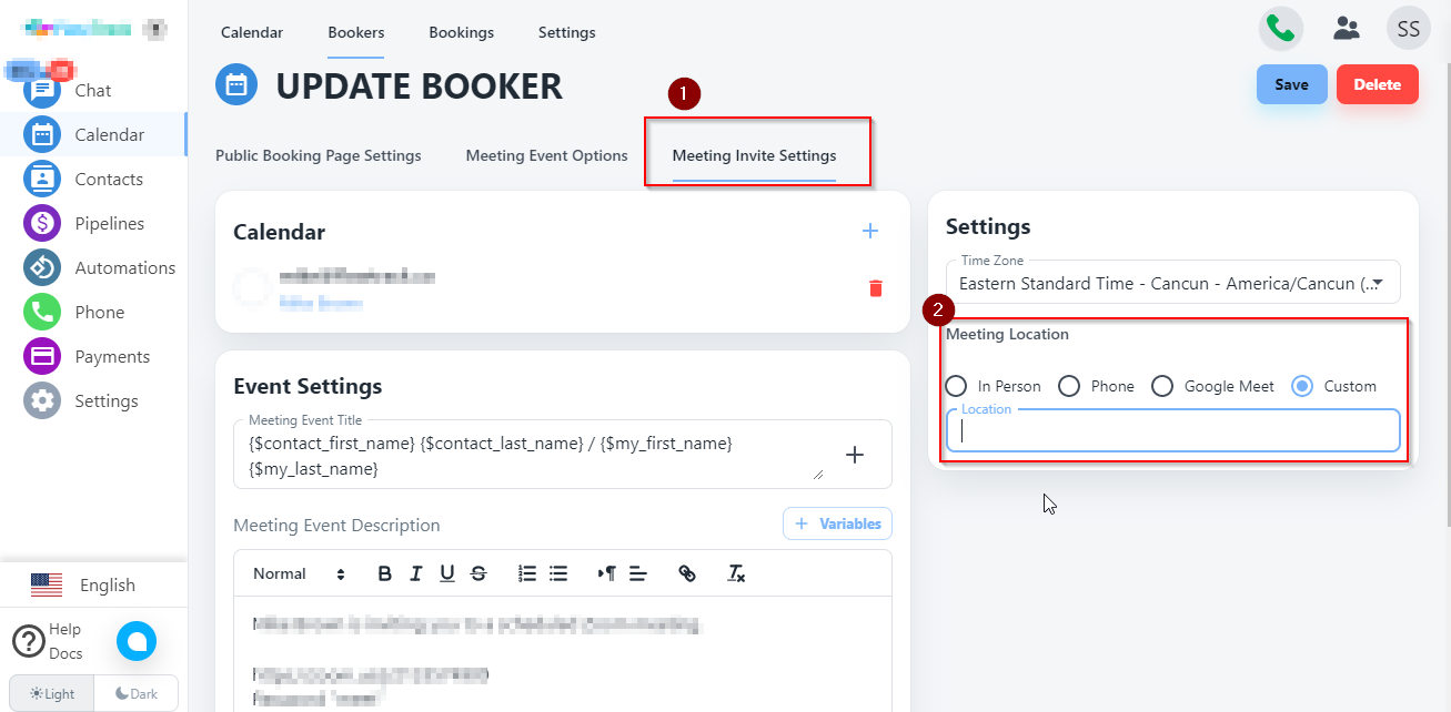 - Select Meeting Invite Setting and from setting select custom option and paste meeting link. Under custom option you can add your private zoom meeting link so your customers can see meeting link on calendars and email.