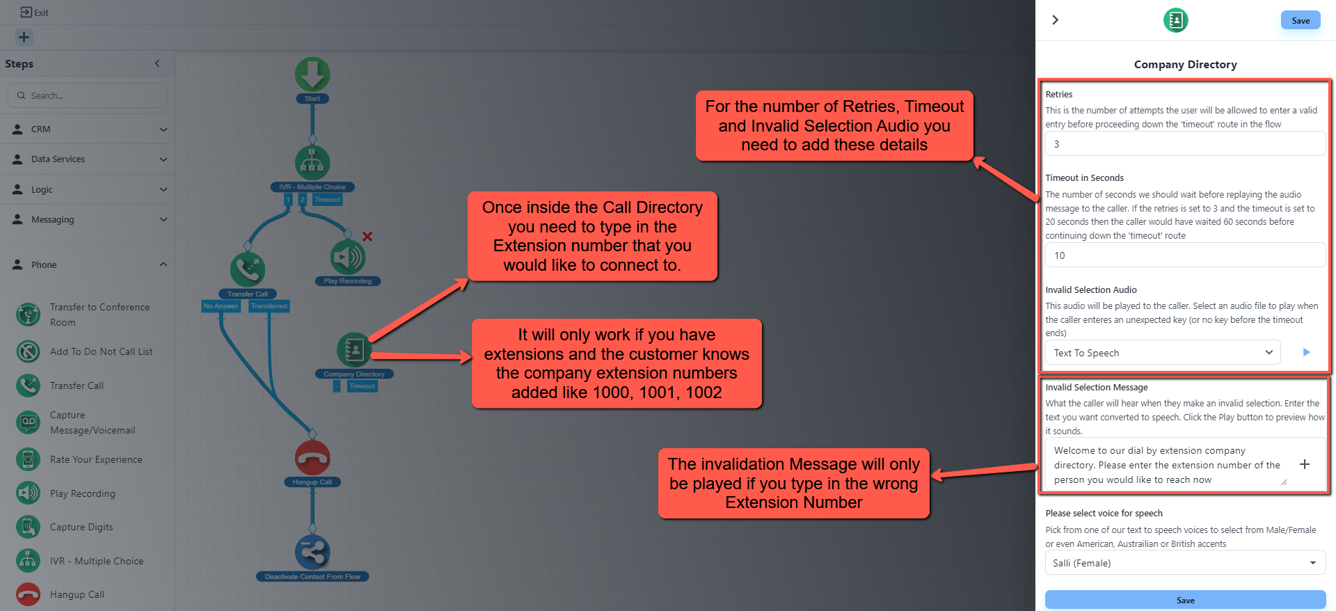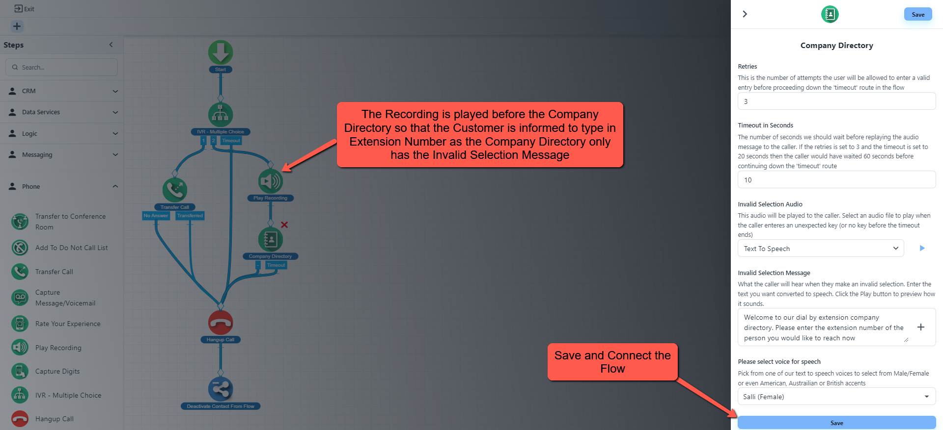 When everything is Setup you need to Save the Settings and Connect the Flow. The Company Directory have a Play Recording step before it which plays a Recording informing the Customer to type in the Extension.