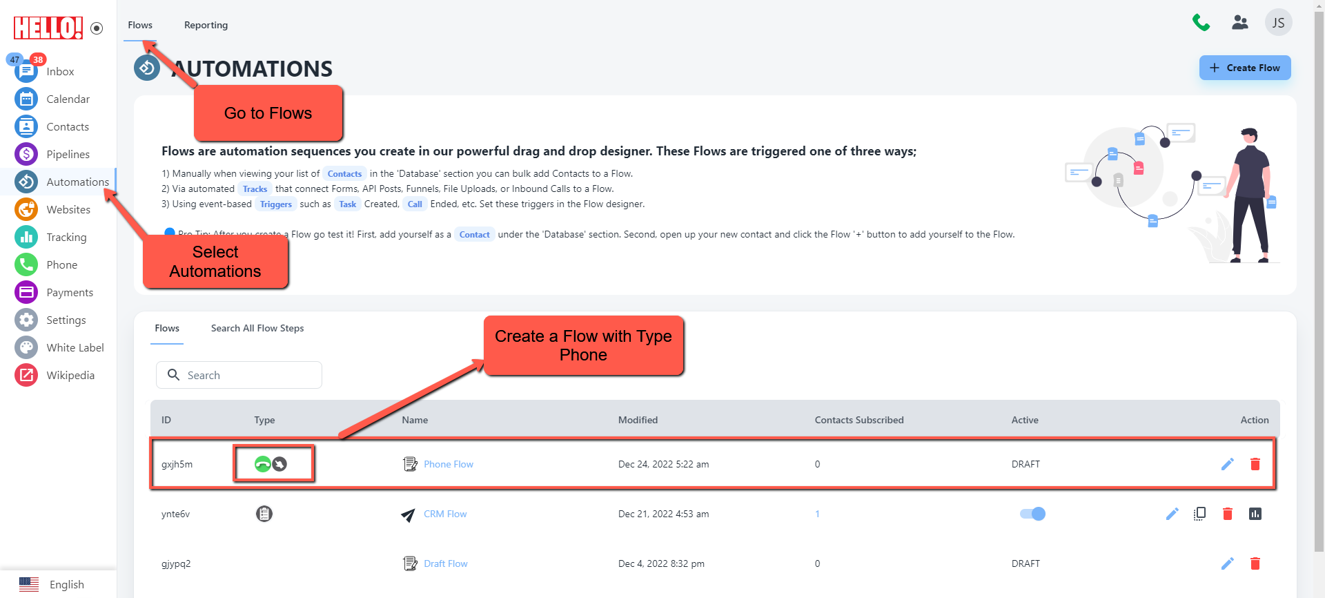 Go to the Automations, Create the type Phone Flow to have the Phone settings in the Flow.