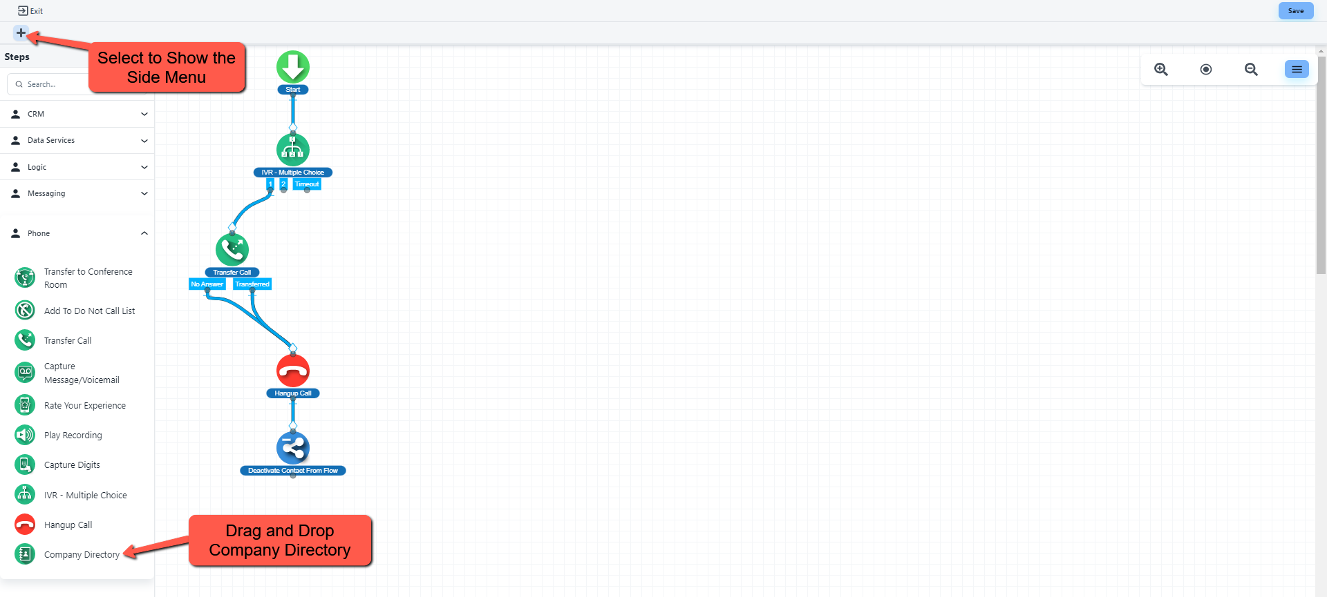 From the side menu Drag and Drop the Company Directory into the Flow.