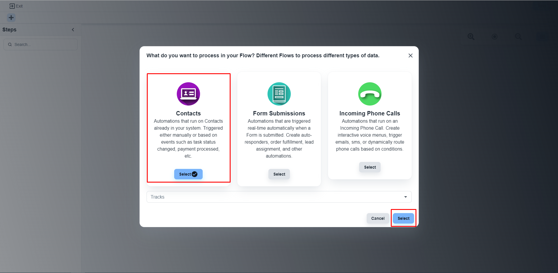 The system will pop up a message box, and you will have to select the first option, 'Contacts'. Now, click on the ‘Select’ button.