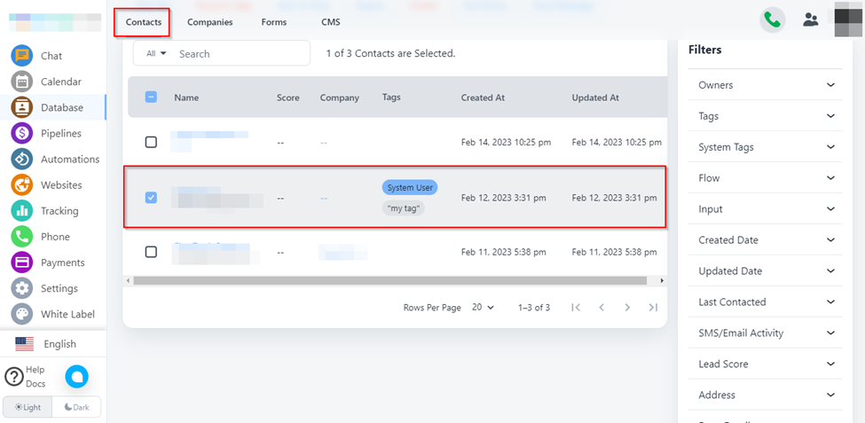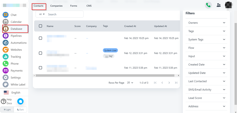 - Navigate to the ‘Database’ on the lef.t side menu. You will get the list of all contacts.