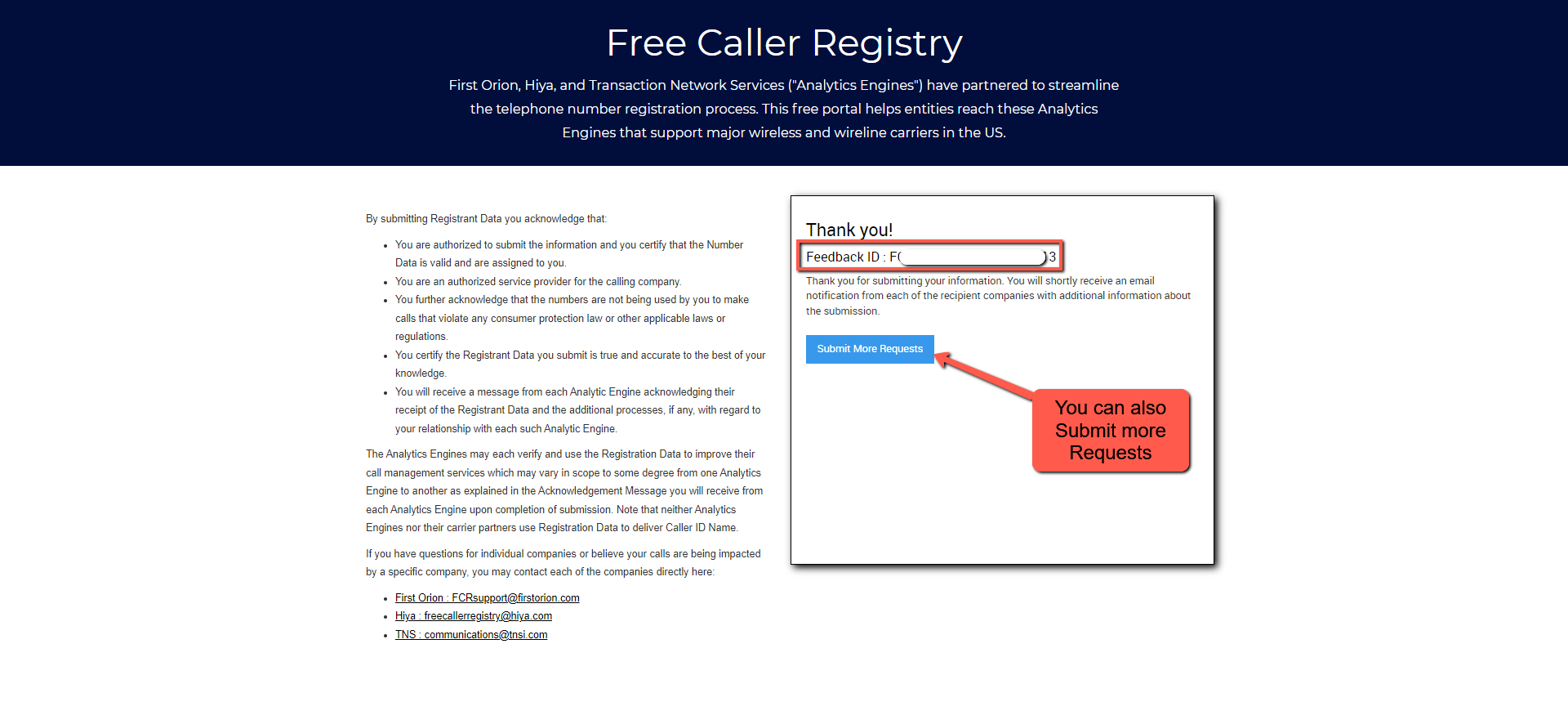 After submitting you will get your Feedback ID, along with submitting more request incase it doesn’t go through. This registration portal may not cover other consumer applications responsible for call labeling or blocking. Additional guidance from the FCC can be found in the Tips to Avoid Having Legitimate Calls Blocked.