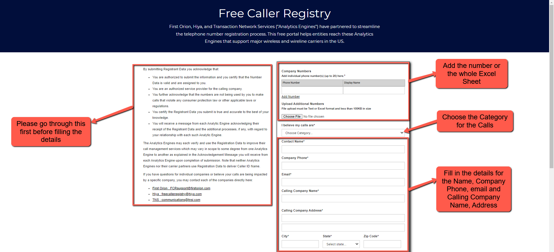 You can start the registration process but before filling the different fields you need acknowledge the details provided. After the acknowledgement you need to start filling in the different information such as the numbers or the Whole Excel sheet of the Numbers, Call Category, Name, Company Phone, Email and Calling Company Name, Address.