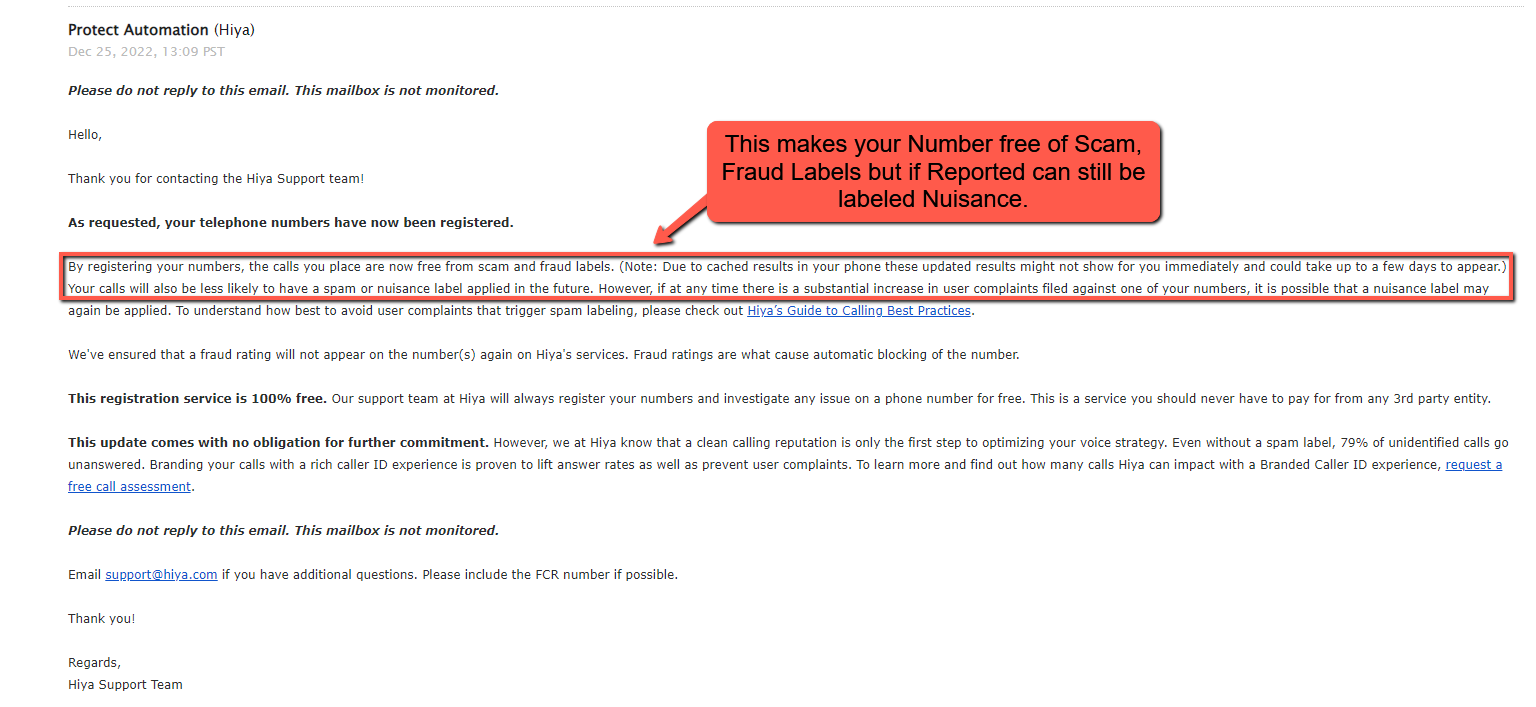 You will soon receive the confirmation email that says your number is free of Scam, Fraud labels, but in case your number is reported by more customers it can be labeled Nuisance and you won’t be able to Call the number.